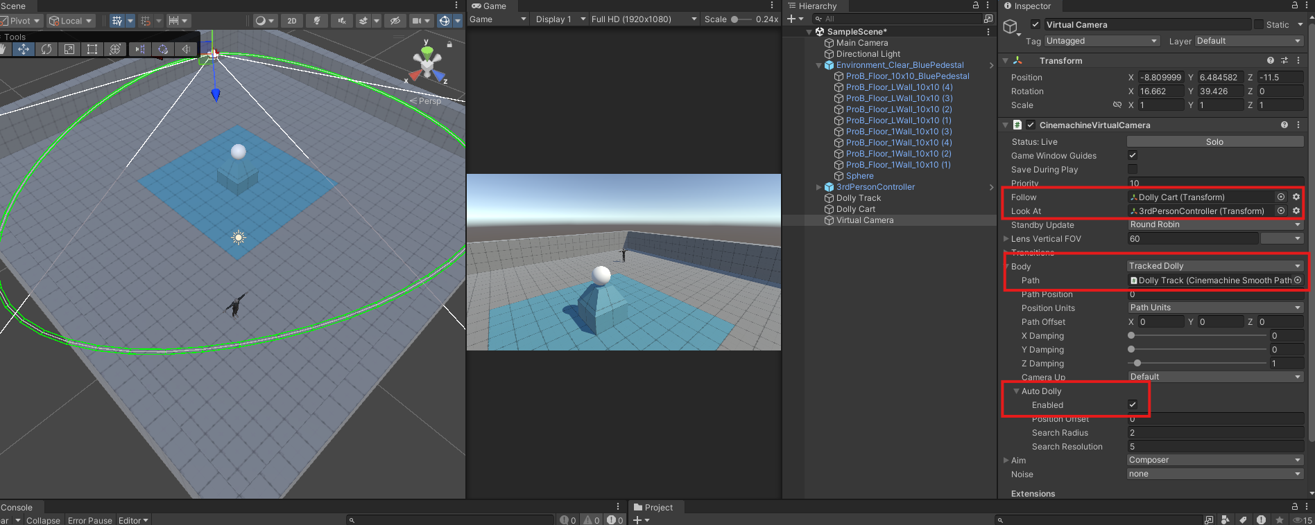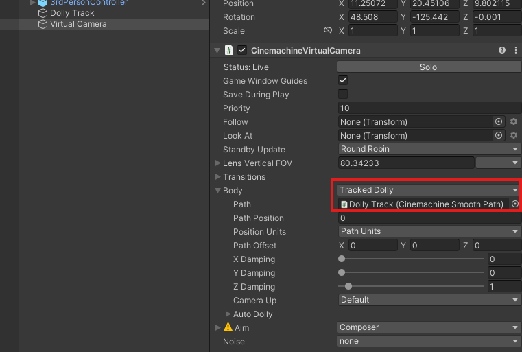 Dolly Camera를 사용하기 위해선 가상 카메라의 Body가 Tracked Dooly로 되어 있고, Path가 트랙으로 되어 있는지 확인해보자.