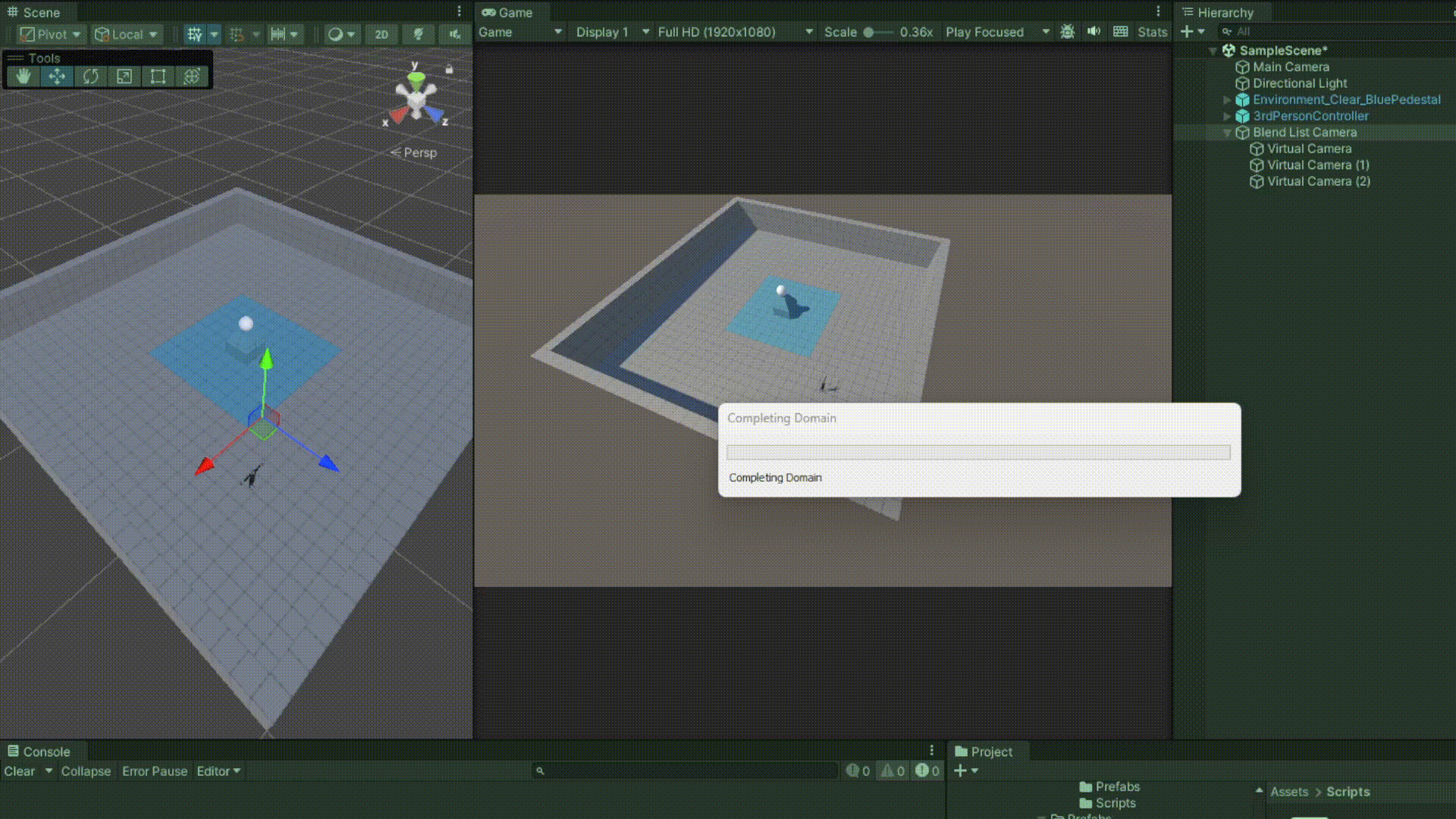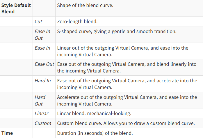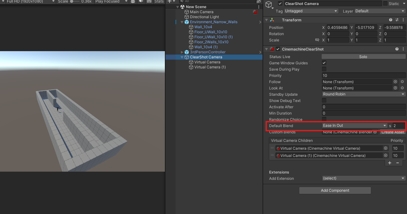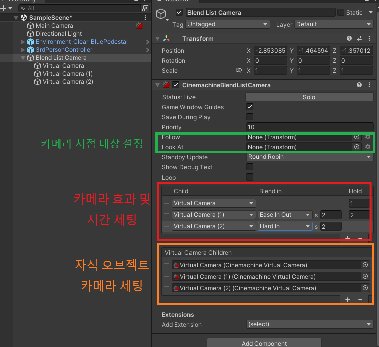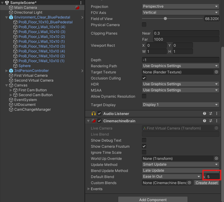 Main 카메라에서 Blend 시간을 조절하여 카메라의 전환 속도도 조절할 수 있다.