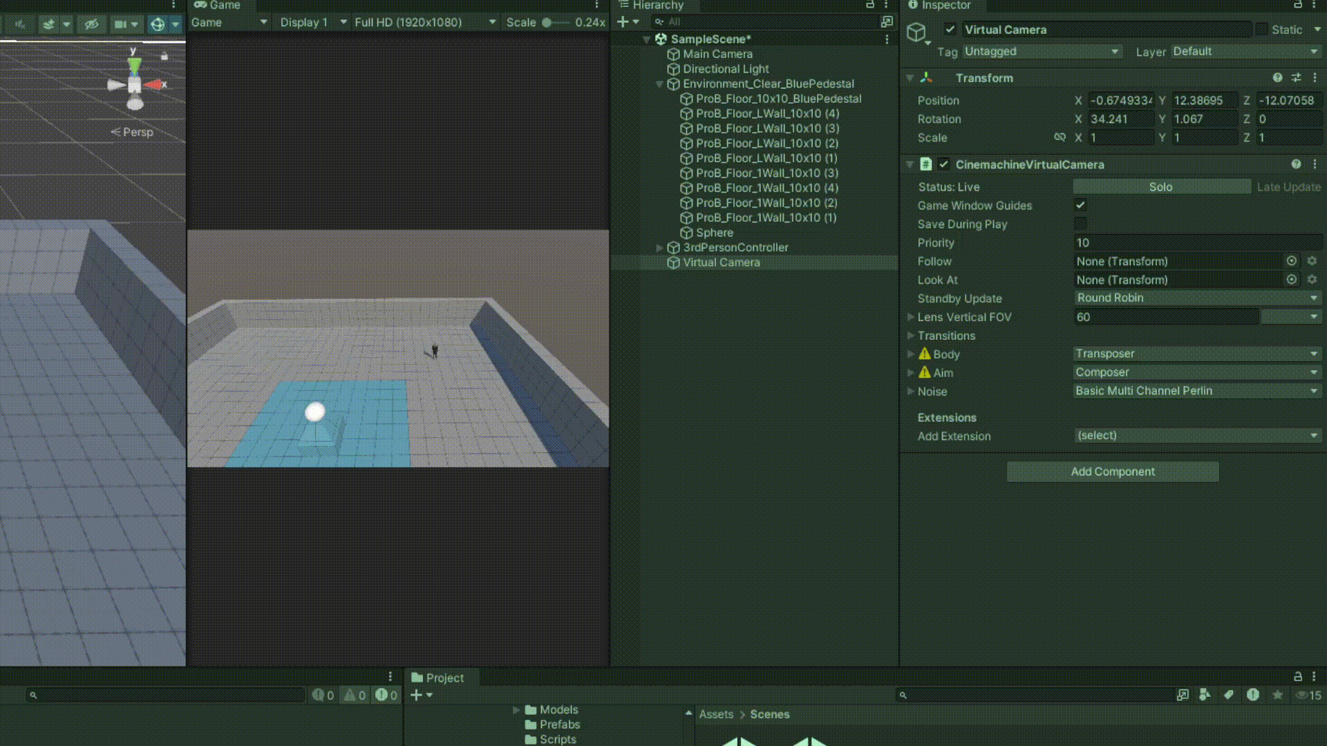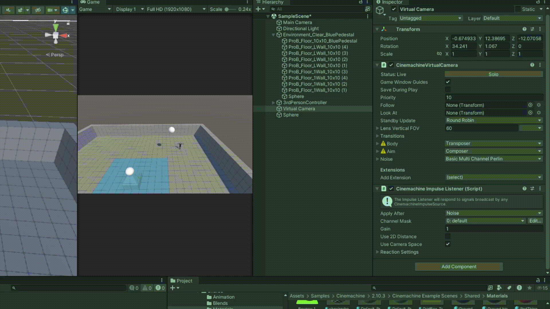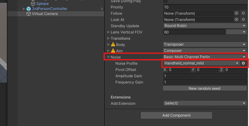 Virtual Camera를 만들고, Noise의 설정을 Basic Multi Channel Perlin과 Handheld_normal_mild로 설정해보자.