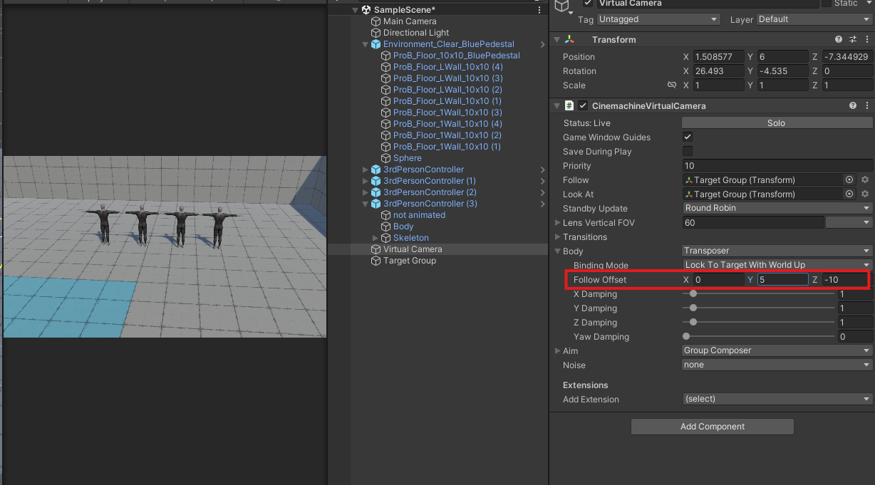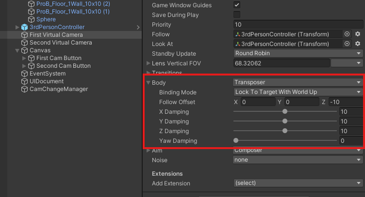 카메라의 자연스러운 각도를 위해 Virtual Camera의 Body 에서 Follow Offset도 만져준다.