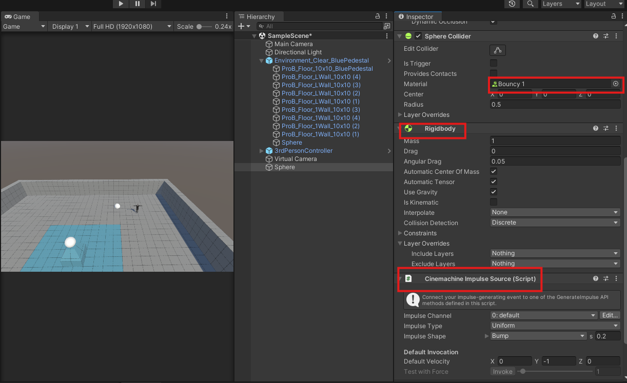 우선 충돌을 줄 물체를 만들기 위해 Sphere을 설정하고, Collider에 Material을 Bouncy1로, Rigidbody와 Cinemachine Impulse Source를 추가한다.