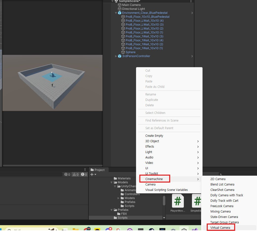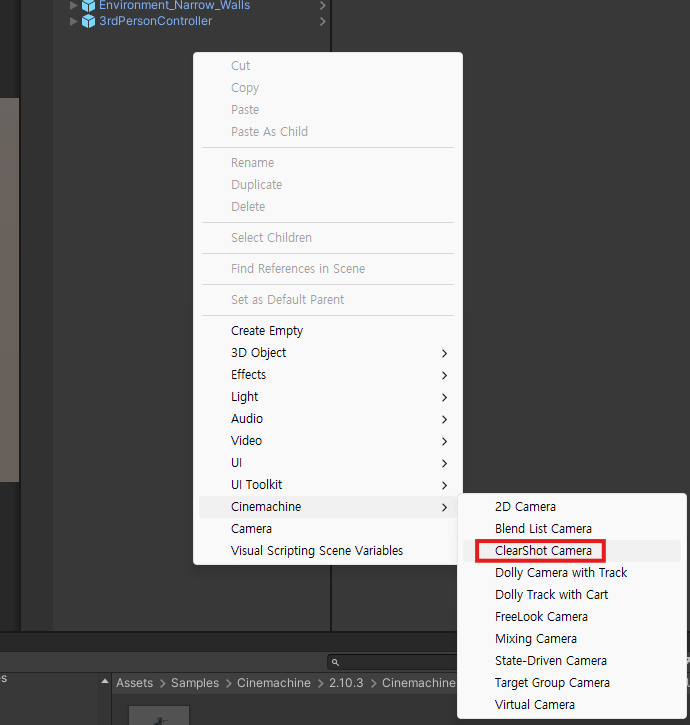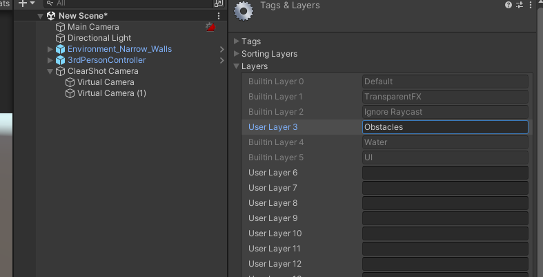 클리어샷 카메라의 시야 전환을 위해 가상카메라를 하나 더 만든 후 적절한 위치에 배치한다. 그 다음으로 장애물로 판정할 Layer를 만든 후 해당 장애물에 Layer를 지정한다.