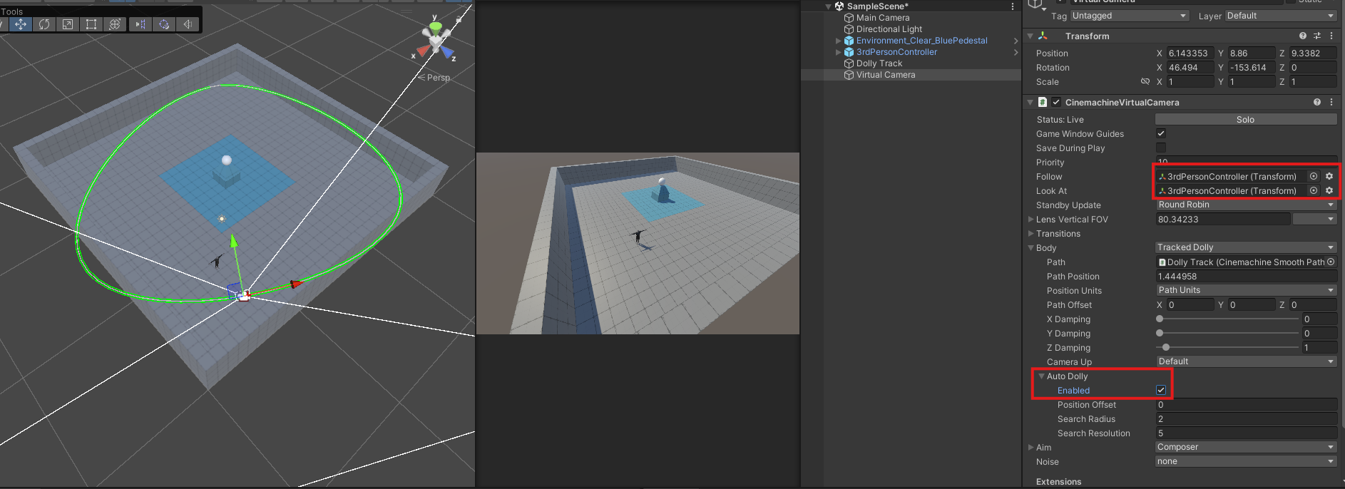 가상 카메라의 Follw를 Dolly Cart로, LookAt은 플레이어로, Dolly Track을 경로로 설정하고 Auto Dolly를 체크해보자.