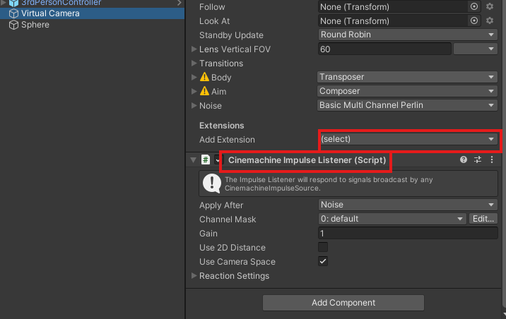 Virtual Camera 에서 Add Extention을 통해 Cinemachine Inpulse Listener를 추가해준다.