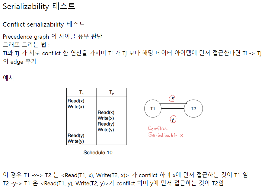 여기에서 사이클이 생긴다는 것이 갑자기 왜 나오나 싶을 텐데, 사이클은 conflict 연산 중 순서가 바뀐 것이 있다는 것을 말한다. conflict serializable이라면 한쪽으로만 화살표가 가야 하고, 사이클이 절대 생기지 않는다. 잘 생각해보면 너무 당연한 것이다.