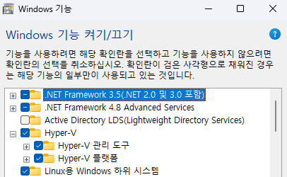 Hyper-V 와 Linux용 Windows 하위 시스템, 가상 머신 플랫폼 체크 확인