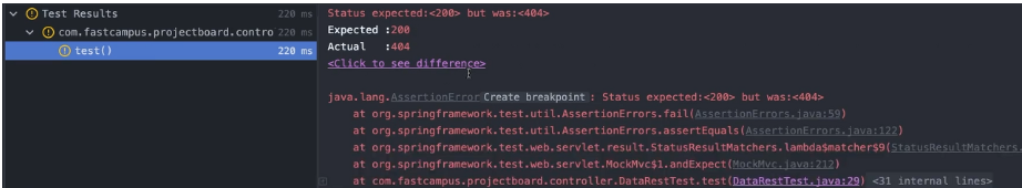 localhost:8080/api/articles를 검색하면 정상적으로 동작하는데 테스트를 진행하게 되면 에러가 발생하는 것을 볼 수 있다. @WebMvcTest는 slice test이기 때문에 controller 외에 Bean들을 로드하지 않고, Controller와 연관된 최소한으로 읽어들인다. 그래서 Data REST의 AutoConfiguration을 읽어들이지 않는다.