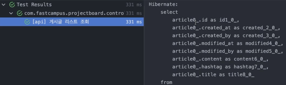 Integration 테스트로 API를 실행한 결과가 Repository까지 전부 실행하여 query까지 출력되는 모습을 볼 수 있다.