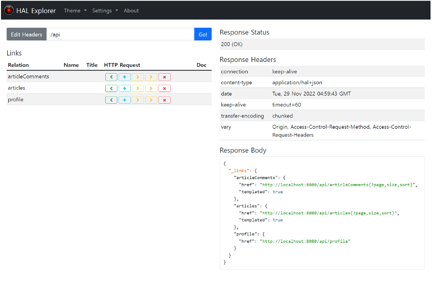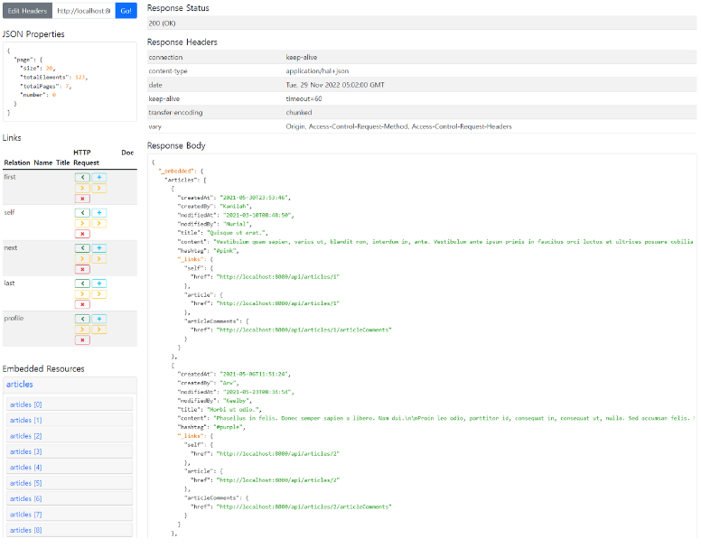 Spring Data REST를 시각적으로 보기 위한 도구로 직접 페이지를 구현하지 않아도 시각적으로 볼 수 있도록 도와주는 도구이다.