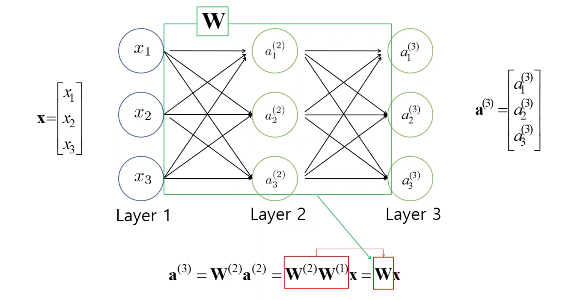 - 아래그림처럼 각 layer는 가중치 행렬(W)과 입력 벡터(X 또는 a)의 선형곱으로 나타내어질 수 있다.