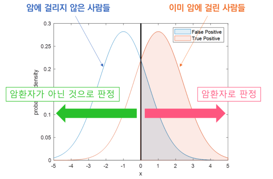 일반적으로 아래 그래프를 암환자에 대한 의사의 판단으로 설명을 많이하는데 오른쪽의 빨간색의 TPR(true positive rate)를 암에 걸렸을 때 암으로 진단한 경우, 왼쪽의 파란색을 FPR(false positive rate) 암에 걸렸을 때 암이 아닌 것으로 진단한 경우를 나타낸다.