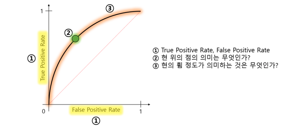 위 그래프에서 굵은 선(threshold)이 아래 ROC 커브의 현 위의 점을 나타내며 x축이 FPR이므로 위 그래프의 굵은 선이 왼쪽으로 갈수록 아래 그래프에서 현 위의 점은 1에 가까워진다.