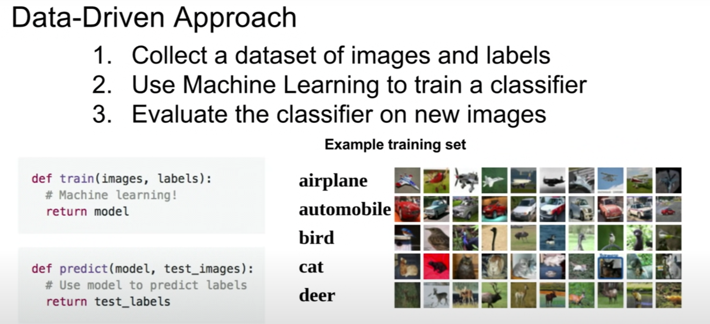 data-driven approach는 하나의 이미지에서 픽셀값을 분석해 image classification을 진행하는 것이아니라 각 물체별로 굉장히 많은 양의 이미지들을 수집한 후 수집된 이미지 데이터를 컴퓨터에 학습시켜 분류 모델을 만드는 방법이다.