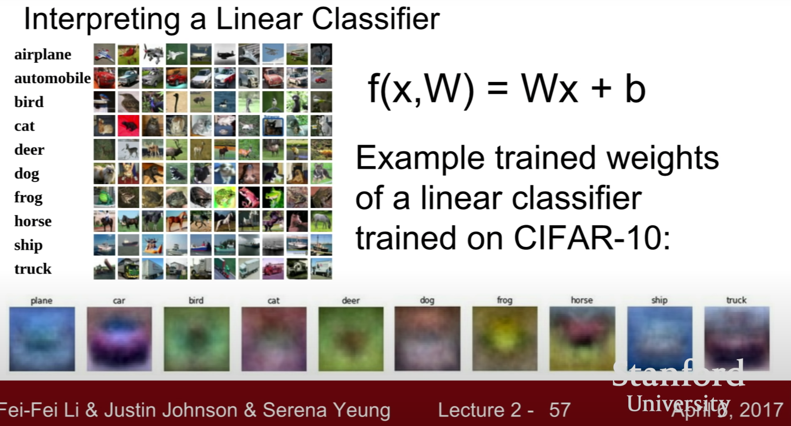 결국 Linear Classification은 각 class에 해당하는 무수히 많은 이미지를 학습해 각 class에 해당하는 가중치 행렬 W와 그 W를 포함하는 함수 f(x,W)를 구하는 것이 목적이라고 할 수 있다.