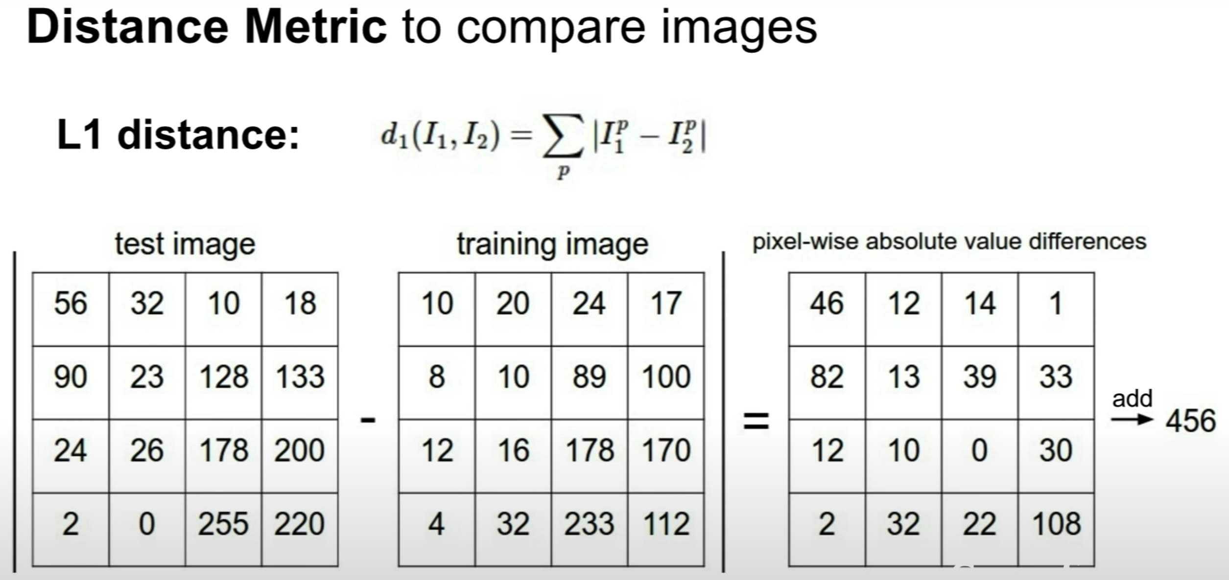 유사한 이미지를 선별하는 과정에서는 다음과 같은 거리(distance) 비교를 통한 알고리즘을 이용한다. 이미지는 픽셀이라는 숫자로 되어있기 때문에 비교하고자하는 각 픽셀값들의 차를 모두구해 그 합이 작을수록 유사하다고 간주하는 방법이다.