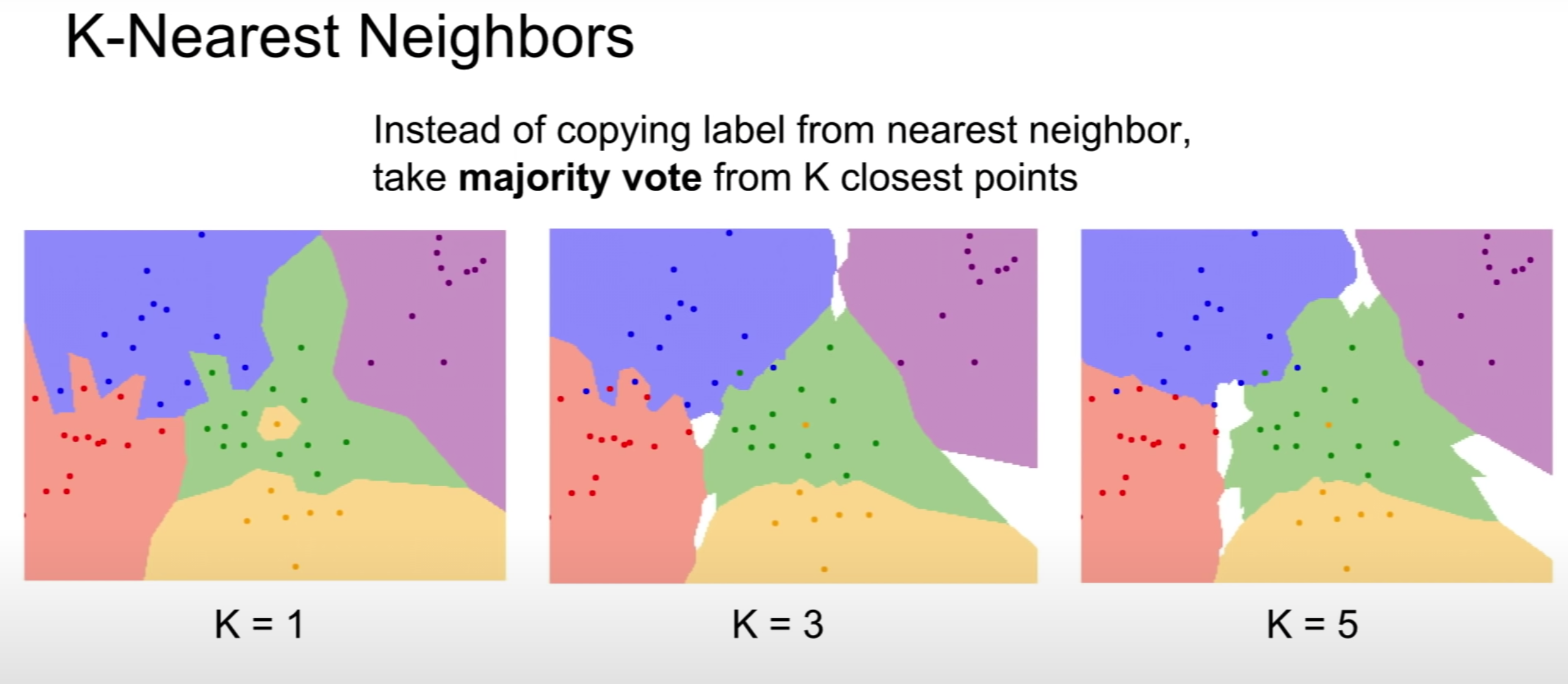 nearest-neighbor의 개선된 알고리즘으로는 K-Nearest Neighbors가 있다. 아래 그림에서 색깔로 구분되는 영역은 class(category of training samples)에 해당하며 그 색은 안에 포함된 각 점들이 가장 가까운 K개의 점으로 부터 참조를 받아 일종의 투표를 진행하는 방식으로 색이 분류된다.