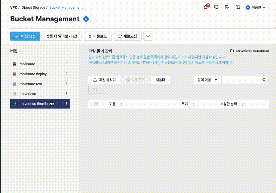 6MB의 사진을 serverless라는 버킷에 업로드Cold Start가 안걸린 상태Cold Start가 걸리면 지연시간이 꽤 걸리는 경우도 있었다.serverless-thumbnail이라는 버킷에 해당 사진의 썸네일이 48KB의 사이즈로 업로드 됨