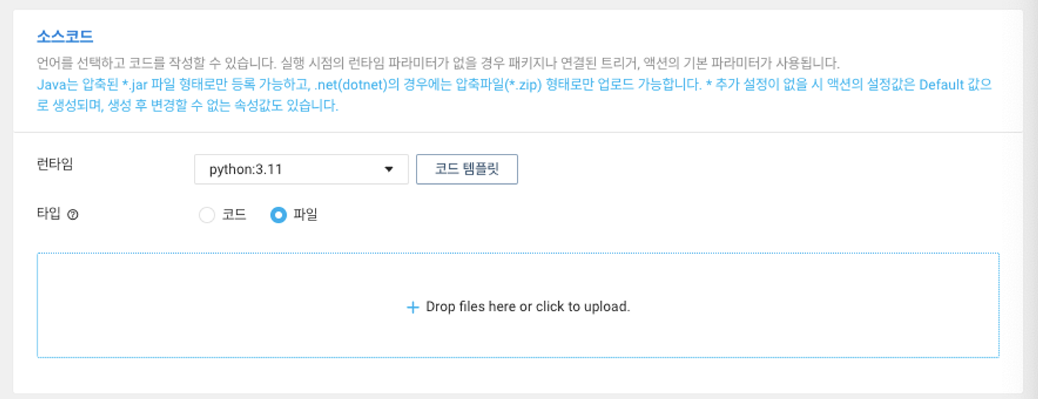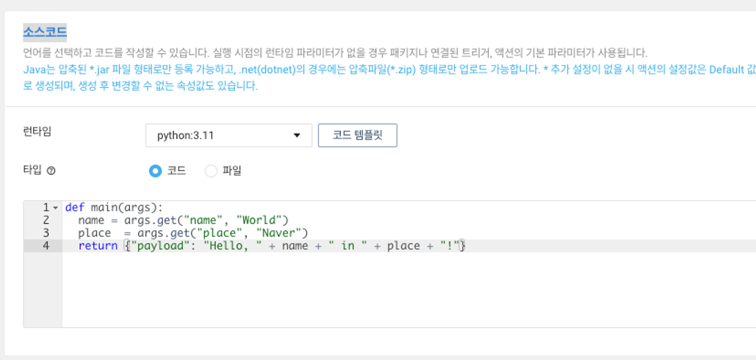 서버리스를 사용하기 위해서는 하나의 함수 형태를 등록해주면 된다. Node.js, Python, Java 등등 몇 가지 런타임을 제공하지만, 우리는 파이썬을 선택했다.