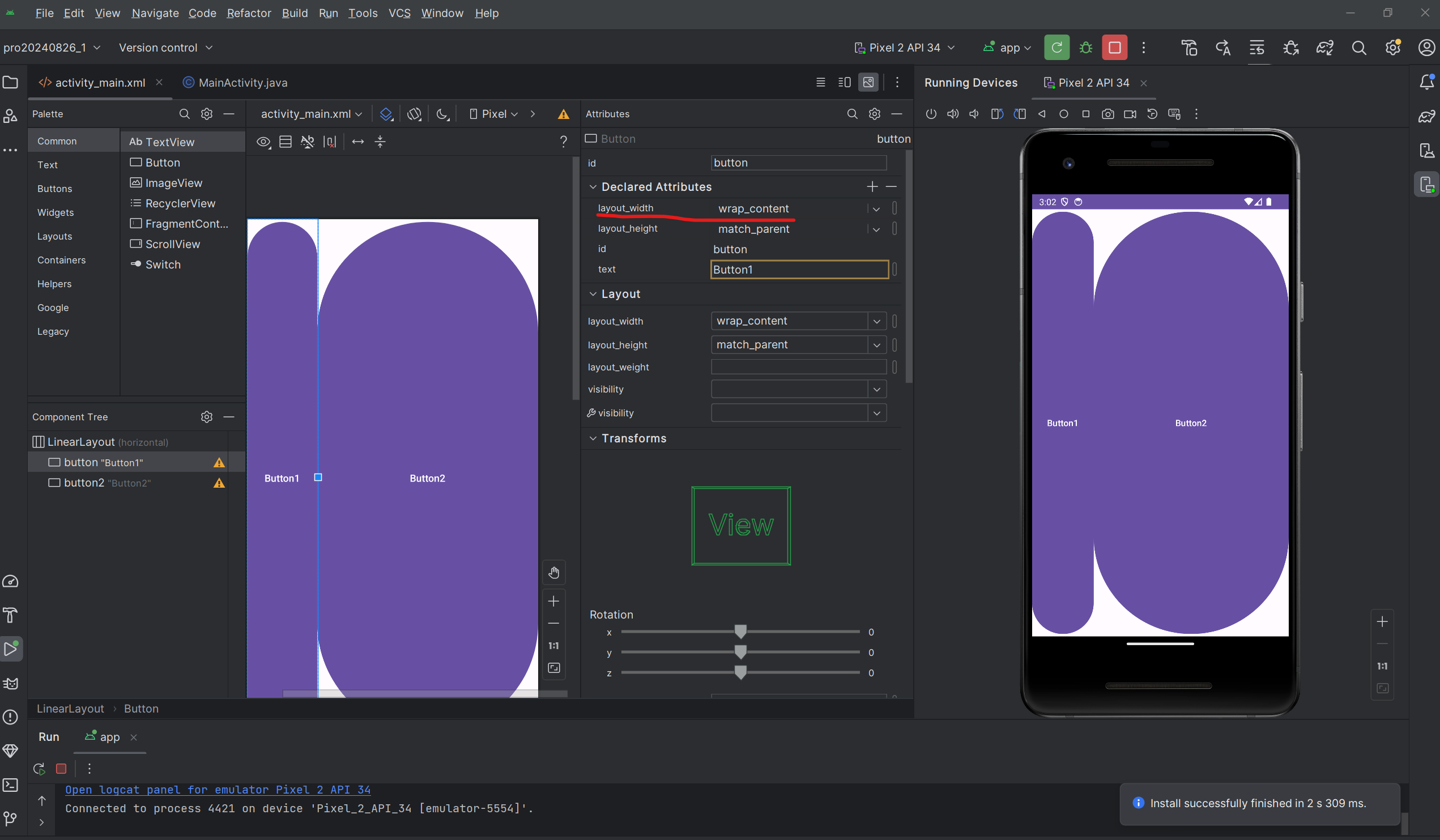 왼쪽 블록 넓이가 match_parent, 오른쪽 블록 넓이가 wrap_parent일때는 왼쪽 블록이 화면넓이 전부 차지,
