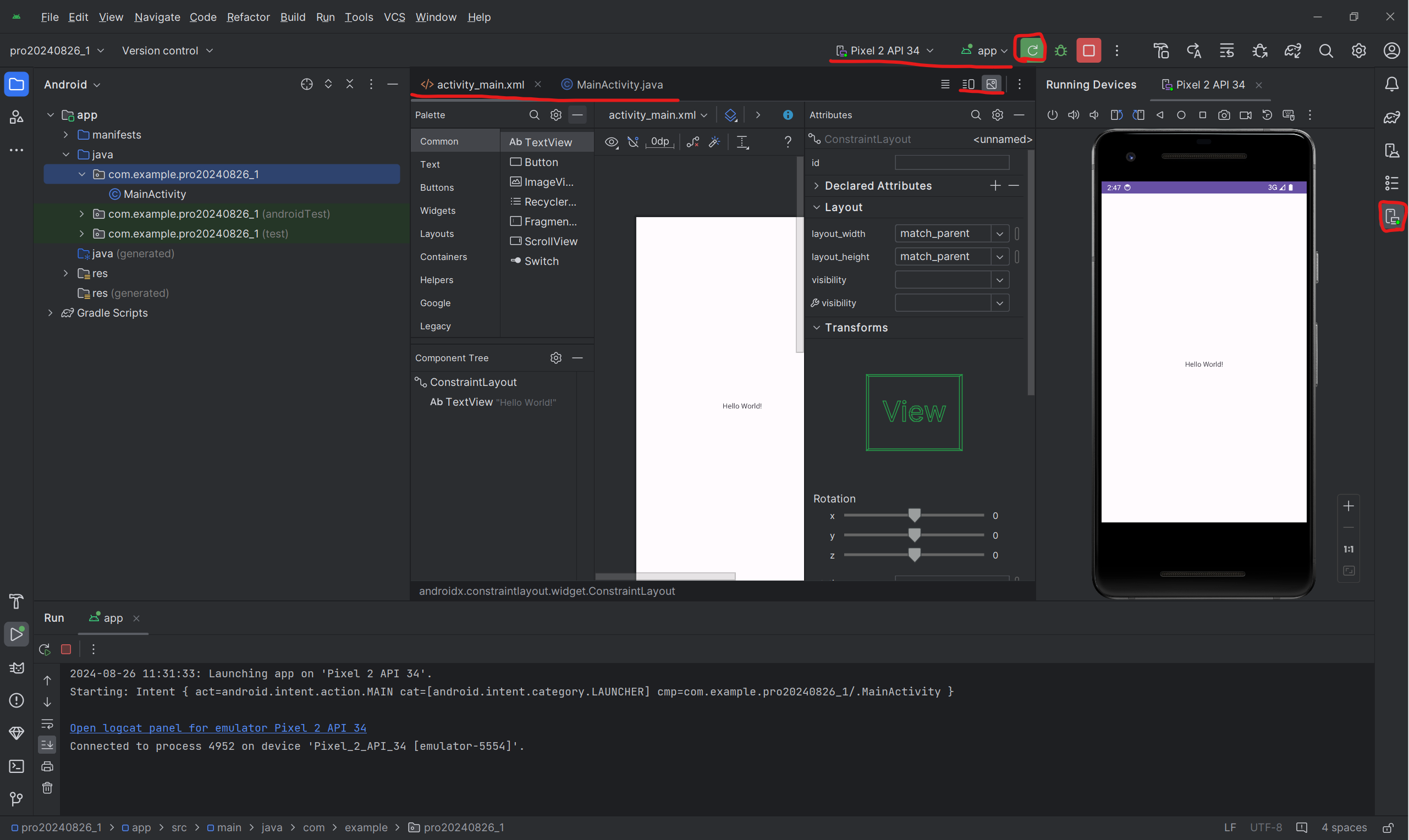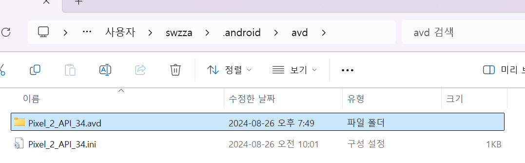 실행이 안된다면 작업관리자에서 Android Studio, qemu-system-x86_64.exe, emulator.exe, adb.exe등 작업중지하고 C:\Users\사용자.android\avd\Pixel_2_API_34.avd 에서 hardware-qemu.ini.lock 삭제후 다시실행