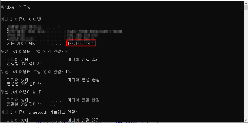 공유기를 사용하고 있다면 다음과 같이 기본 게이트웨이를 확인할 수 있다.