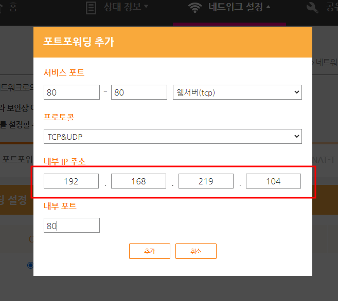 이때 내부 IP 주소를 입력해야 하는데 이는 서버 PC의 내부 IP를 의미한다.