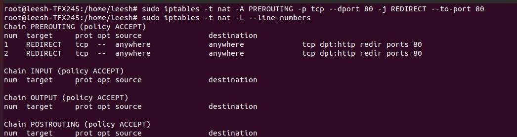 sudo iptables -t nat -A PREROUTING -p tcp --dport 80 -j REDIRECT --to-port 80
