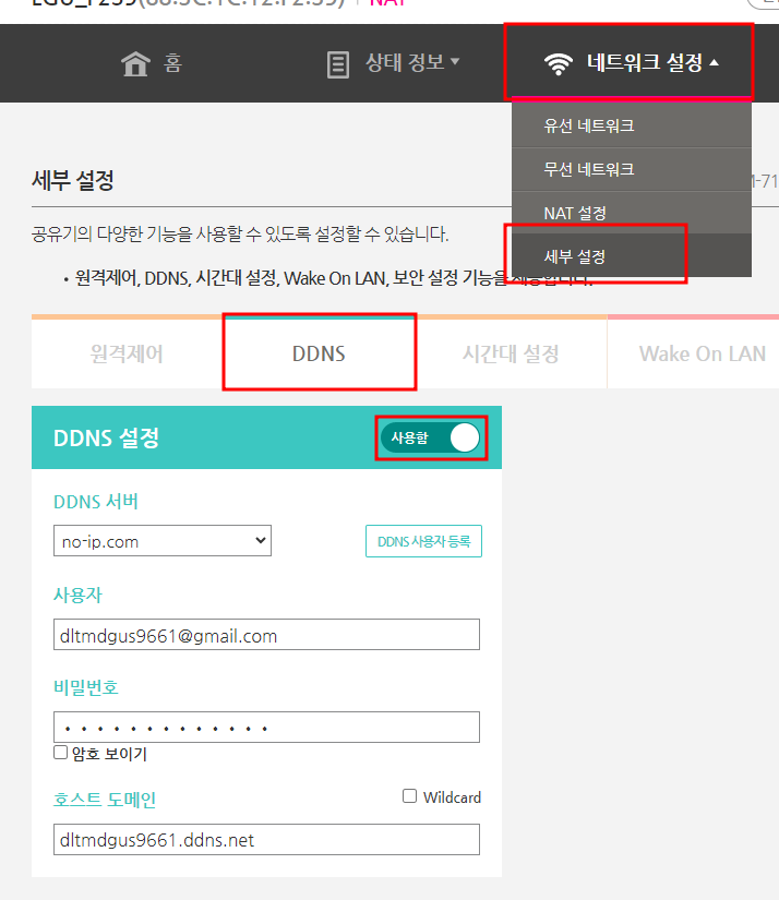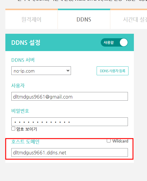 no-ip에서 만든 계정과 비밀번호, 도메인을 입력하면 된다.