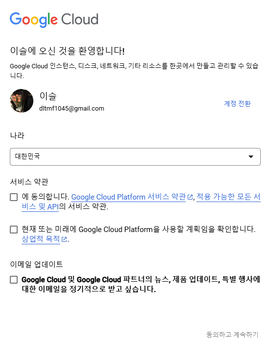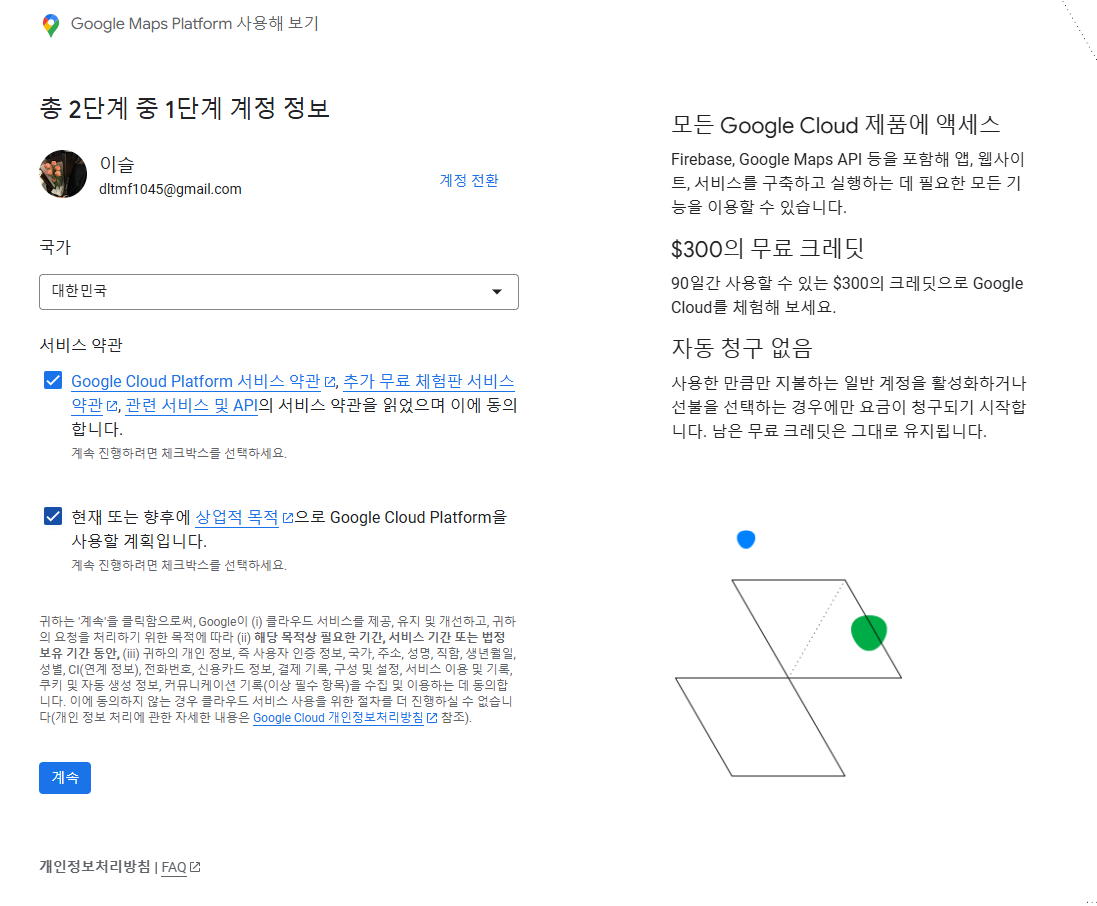 결제 정보를 입력해줘야 하는데 어차피 google api 사용은 하루에 2,500건, 초당 10건의 요청에 한해서만 무료. 그 이상 사용하려면 유료로 전환하면 되는 거라서 결제는 되지 않는다.