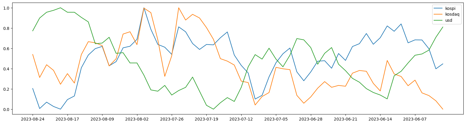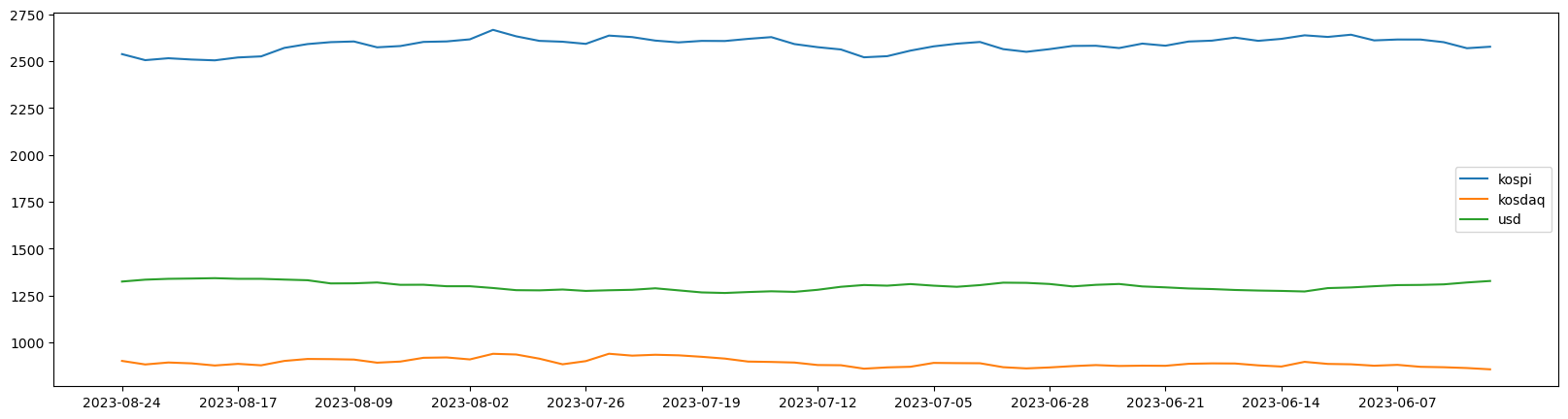 #1단계-전처리 : data, kospi, kosdaq, usd 칼럼이 있는 데이터 프레임으로 변경, 값을 obj -> float로 변경해주기 위해서 ,를 제거