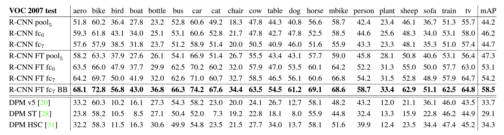 R-CNN은 PASCAL VOC 2010 및 2012 데이터셋에서 기존 방법보다 높은 mAP(mean Average Precision)을 달성하였다.