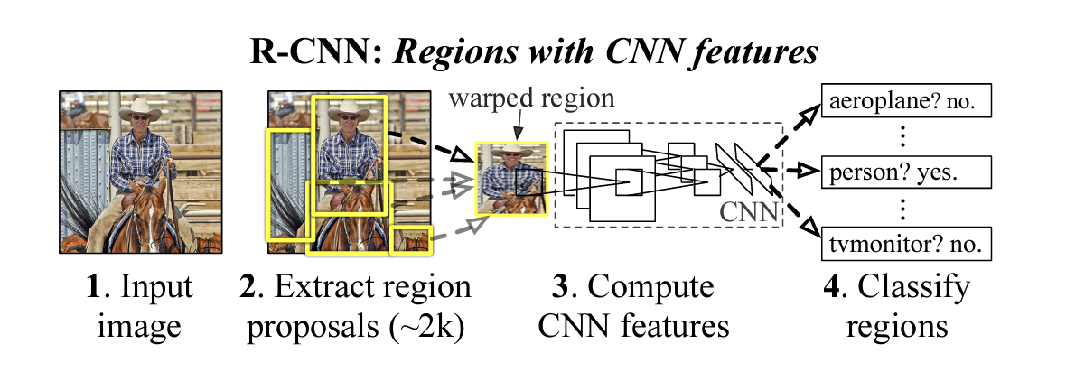 R-CNN은 selective search를 통해 객체 후보영역(region proposals)을 생성하고, 각 영역에 대해 CNN을 적용하여 객체 여부를 분류하는 새로운 접근법이다.