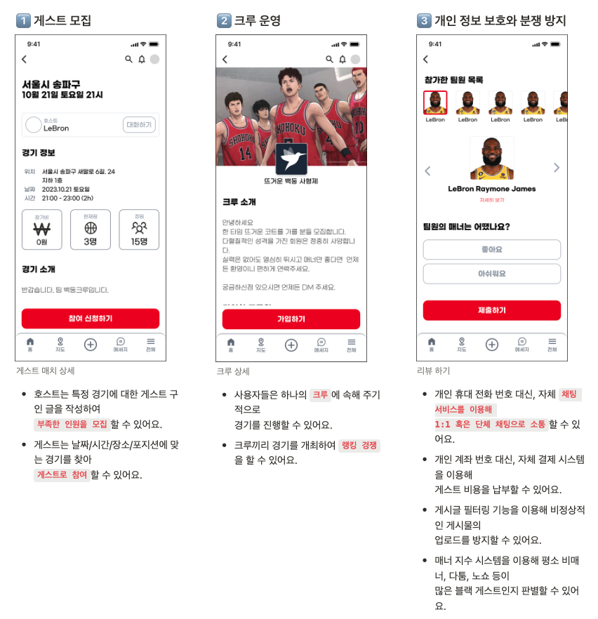 주요 기능으로는 게스트 모집, 크루, 분쟁 방지 가 있다.
