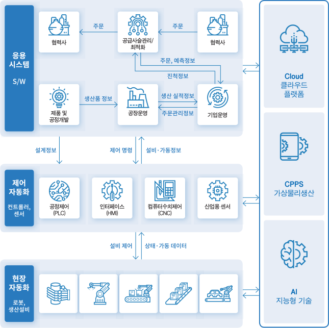 제품을 생산하는 공정만 바뀐다고 해서 ‘스마트공장’ 일까? 아니다. 스마트공장은 제품 기획·개발부터 양산까지, 주문에서부터 완제품 출하까지 제조 관련 모든 과정을 말한다.응용 시스템뿐 아니라 현장자동화와 제어자동화 영역까지 공장 운영의 모든 부분을 포함하는 것이다.