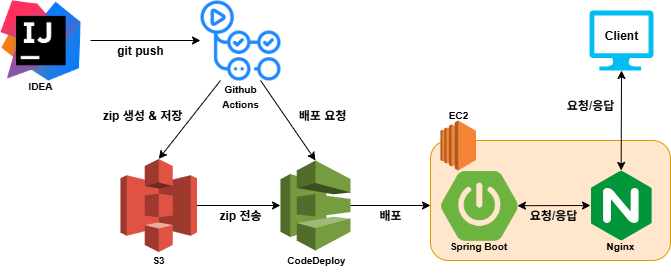 [GitHub] → [GitHub Actions] → [S3] → [CodeDeploy] → [EC2] + [Nginx] → [HTTPS 응답]