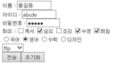 <input type="submit" value="전송"><input type="reset" value="초기화">