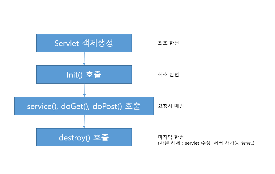 처음 객체를 생성하고 Init()메소드를 호출하는데 이것은 최초 한번만 실행된다. 그 다음 doget이나 doPost등은 요청이 왔을 때 마다 처리해주는 것이다. 그리고 마지막에 destroy()로 지워주는 것이다.