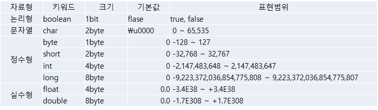 매우 간단한 예제이다. 여기서! int와 char가 중요하다. 이것들은 바로 자료형이다. Java에는 4가지의 자료형이 존재한다. 아래 표를 참고하자.
