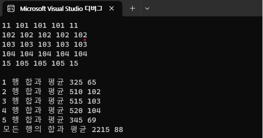 std::cout << "모든 행의 합과 평균 " << Tsum << " " << Tsum/25 << " " << std::endl;