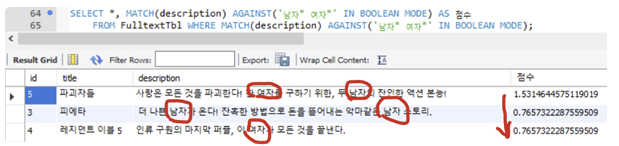 SELECT *, MATCH(description) AGAINST('남자* 여자*' IN BOOLEAN MODE) AS 점수