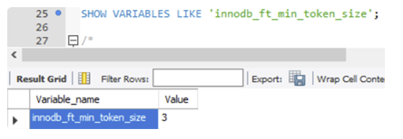 SHOW VARIABLES LIKE 'innodb_ft_min_token_size';
