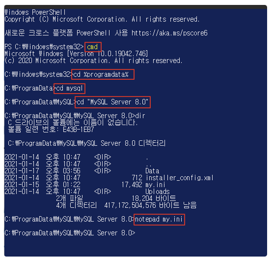 그리고 맨 아래 innodb_ft_min_token_size=2 값을 넣고 저장하고 > net stop mysql + > net start mysql 로 mysql을 재시작해주면 적용이 완료 된다.