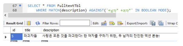 WHERE MATCH(description) AGAINST('남자 +여자' IN BOOLEAN MODE);