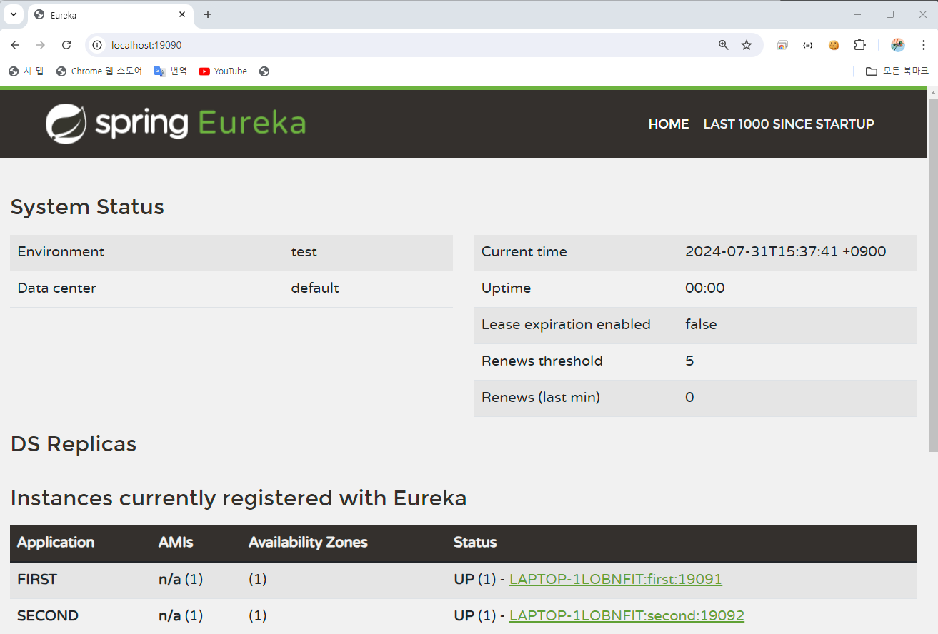 - [그림 4]에서 FIRST와 SECOND라는 이름의 두 개의 애플리케이션이 각각 19091번 포트와 19092번 포트에서 실행 중 (Status: UP)인 것을 확인할 수 있다.