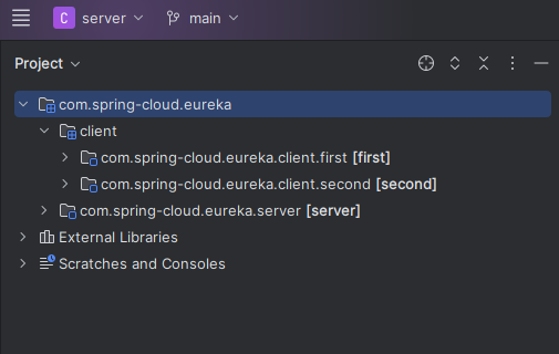 - server에는 Eureka Server 의존성을, 두 클라이언트에는 Eureka Discovery Client, Spring Web 의존성을 주입한다.
