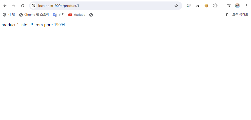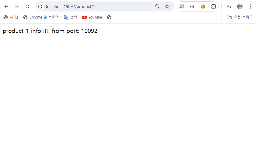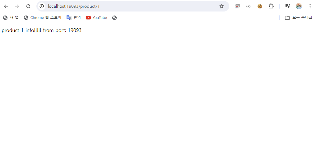 - [그림 3]처럼 http://localhost:19092/product/1에 접속하면 [그림 4]의 ProductController 내부의 getProduct()에서 반환하는 값이 잘 출력되었음을 확인할 수 있다.