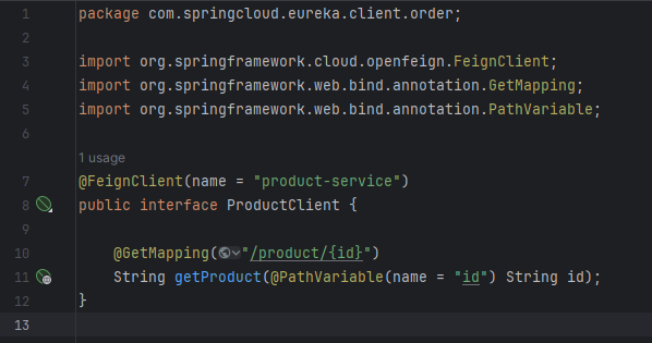 - @FeignClient(name = "product-service")를 이용하여 order 서비스가 product-service와 통신하여 특정 상품의 정보를 가져올 수 있도록 한다.
