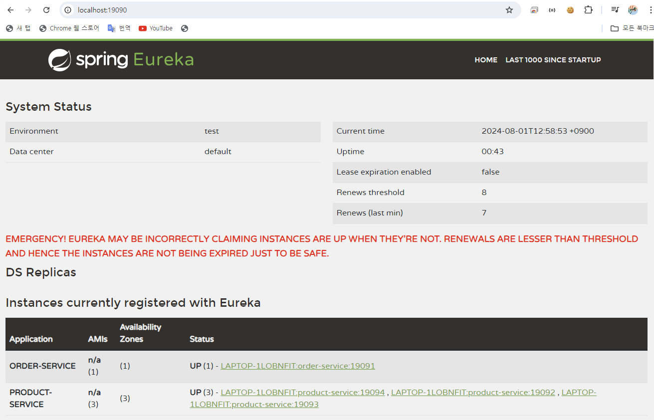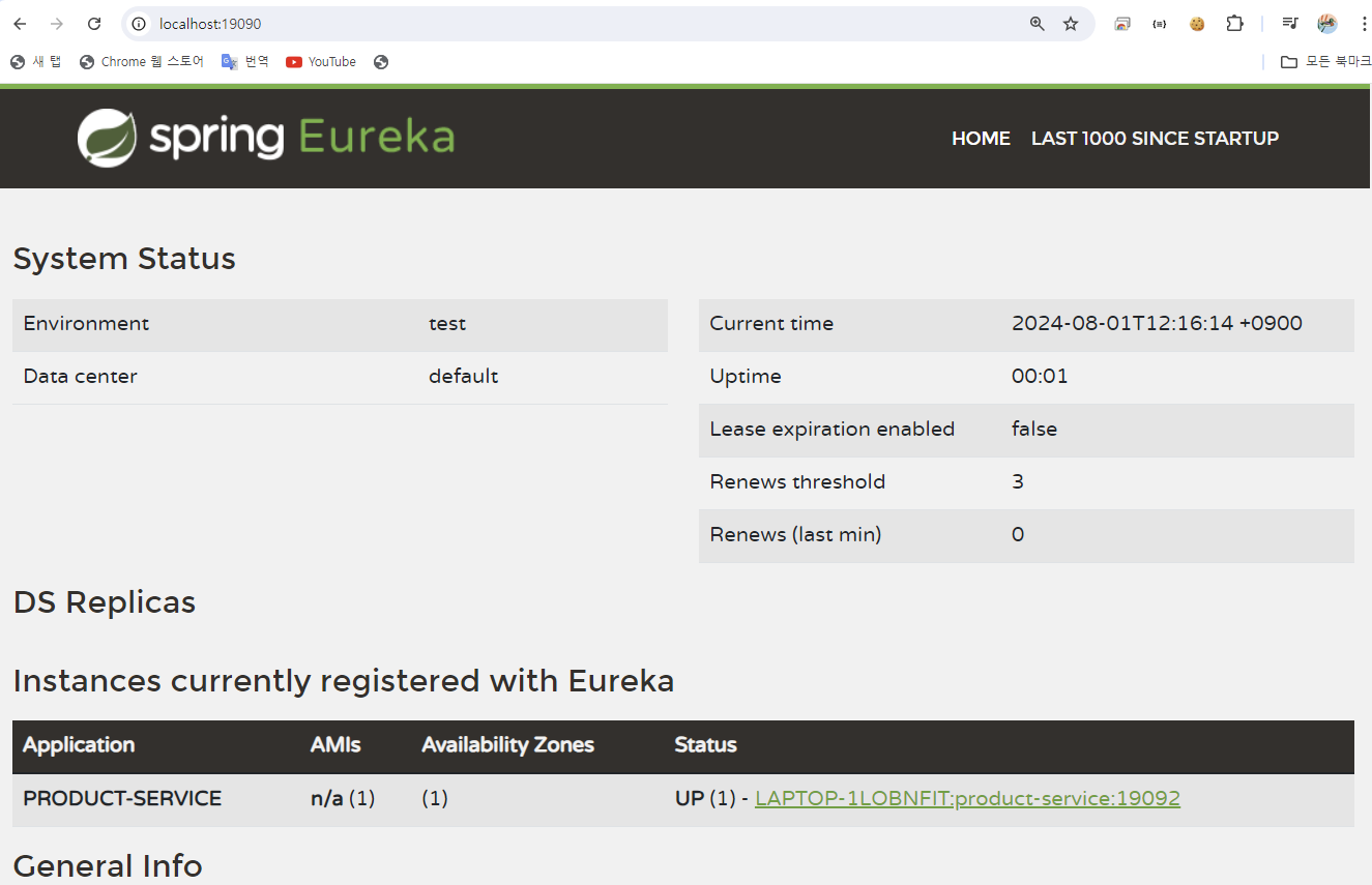 - [그림 2]에서 포트 번호가 19092인 PRODUCT-SERVICE가 실행 중 (Status: UP)임을 확인할 수 있다.