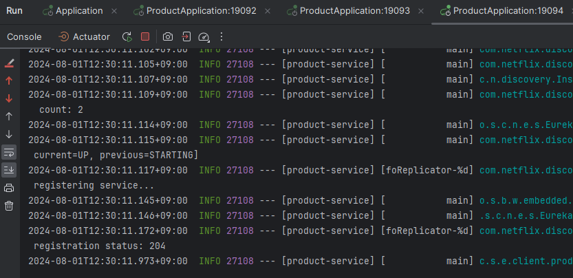 - 이번에는 포트 번호가 19093, 19094인 ProductApplication들도 실행시킨다.