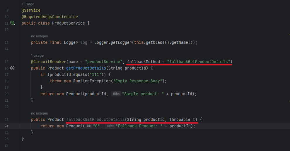 [그림 1] - Fallback Method defined in ProductService